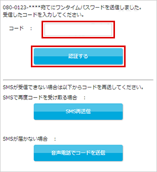 「SMS認証または電話認証」で取得したコードをご入力いただき、「認証する」ボタンをタップしてください。