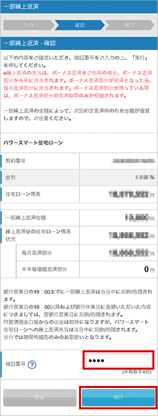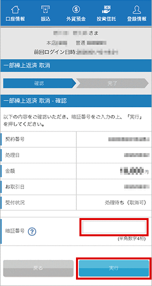 内容を確認のうえ暗証番号をご入力いただき、「実行」をクリックしてください。
