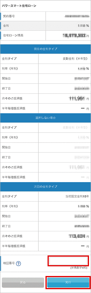 内容を確認のうえ、暗証番号をご入力いただき「実行」ボタンをクリックしてください。