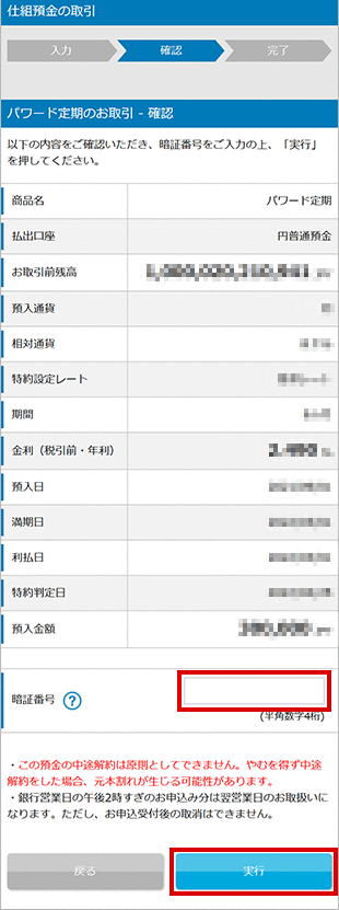 内容をご確認いただき、4桁の暗証番号をご入力のうえ、「実行」ボタンをタップしてください。