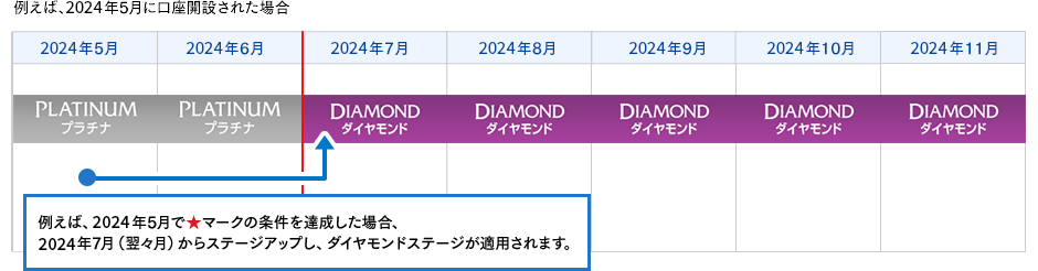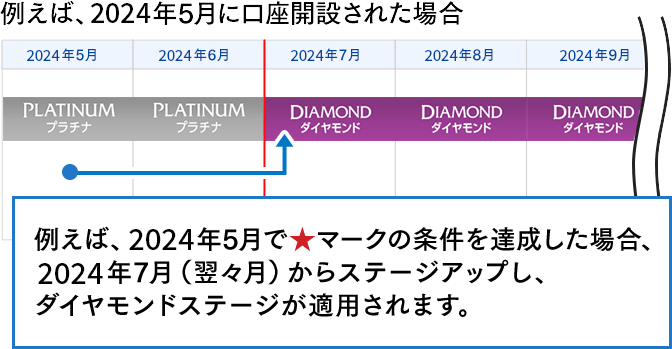 - ★の条件でステージアップした場合を除き、口座開設後7ヵ月目以降のステージは、通常のステージ判定によりステージを見直しいたします。
